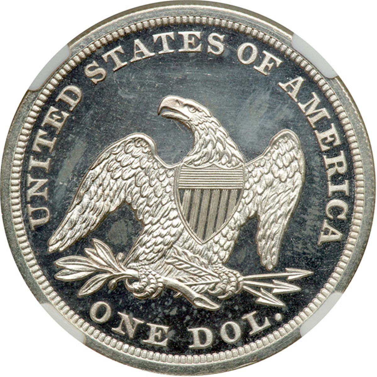 Both sides are attractively and originally brilliant in their two-tone composition of black-on-white or white-on-black iridescence. The underlying mirror is deep, watery, and sparkling fresh with fine visual effects readily evident. Overall sharp in strike with no marks or heavy hairlines that would call into question the validity of the Gem designation, the devices are snowy white and picture perfect. This lot represents a bidding opportunity for the Seated Dollar connoisseur, one that is surely not to be missed if at all possible. The experienced auction-goer knows when to keep bidding. Pop 2; 8 finer.