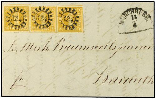 1865 MUNICH a BAIREUTH. 1 Kr. amarillo, tira de tres. mat. numeral 324. Excepcional calidad.