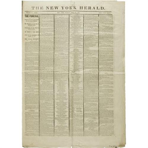 <B>1865 </B></I><B><I>New York Herald</B></I></B></I><B> With Abraham Lincoln Funeral Content</B></I>. 8 pages, 16.5” x 23”, New York, April 23, 1865, top edge uncut, light toning, especially at the edges, a few minor tears at the edge, else in near fine condition. This edition contains the full schedule for the program of Lincoln’s funeral, including railroad arrangements. The edition also contains updates on Lincoln’s assassins and a story of Confederate general Joseph E. Johnson’s holding out against Sherman’s troops in North Carolina. Johnson would surrender his army to Sherman three days later. <I>Ex. Henry E. Luhrs Collection</B></I>.<BR><BR><BR><b>Shipping:</b> Flat Material, Small (<a target="_blank" href="http://www.heritageauctions.com/common/shipping.php">view shipping information</a>)