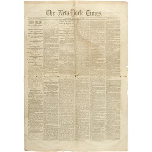 <B>1865 Edition of the New York Times With the Story of Capture of Jefferson Davis and the Trial of Lincoln’s Assassins</B></I>. 8 pages, 16” x 23.5”, May 15, 1865, toned with some faint water stains, ragged around the edges, with some splits in the folds, else near very good. Includes the sordid details of the capture of “Jeff. Davis, the petticoat hero” and an account of the first day of the trial of Lincoln’s assassins. A particularly noteworthy edition.<BR><BR><BR><b>Shipping:</b> Flat Material, Small (<a target="_blank" href="http://www.heritageauctions.com/common/shipping.php">view shipping information</a>)