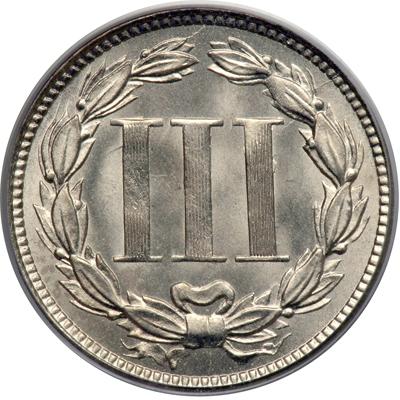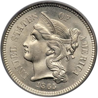 1865 Nickel Three Cents. PCGS graded MS-66. A beautiful untoned example. The surfaces are radiant, pulsing with nickel-brilliant color, and quite lustrous. Pop 36; 2 in MS67. (PCGS # 3731).