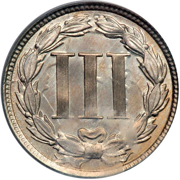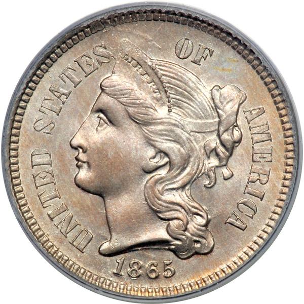 1865 Nickel Three Cents. PCGS graded MS-65. A gem specimen with just a hint of light toning. This is the first year of issue. Light die clash marks only on the reverse, and this barely intrudes on the Roman numeral's stripes. Pop 106; 39 finer (PCGS # 3731) .