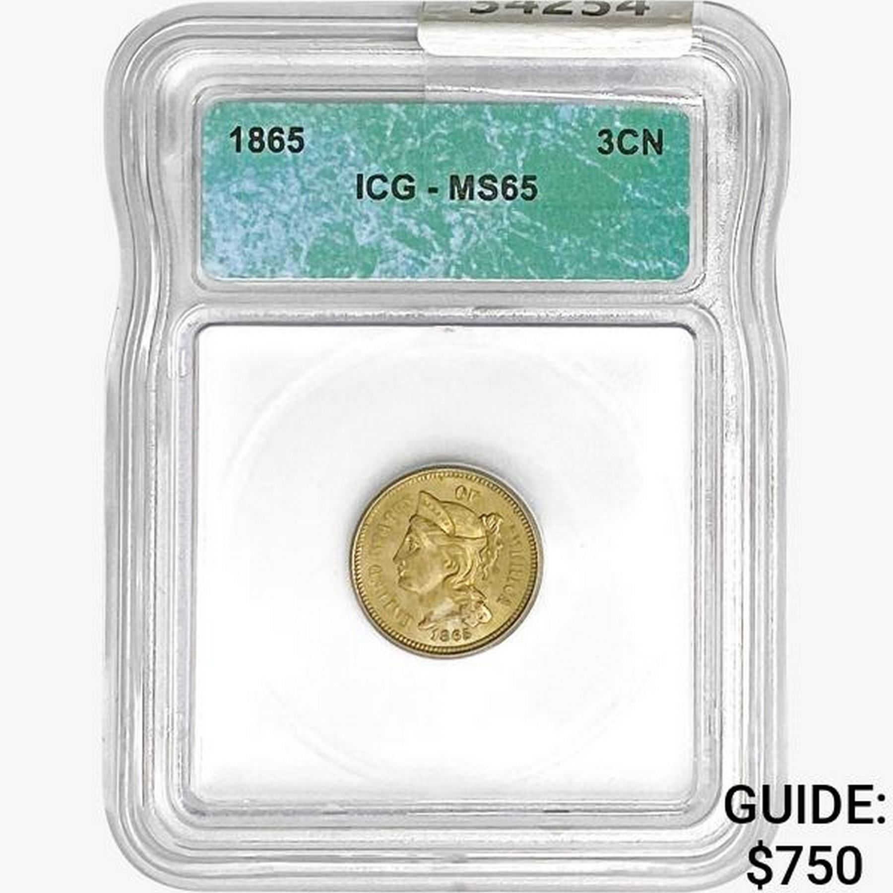 1865 Nickel Three Cent ICG MS65