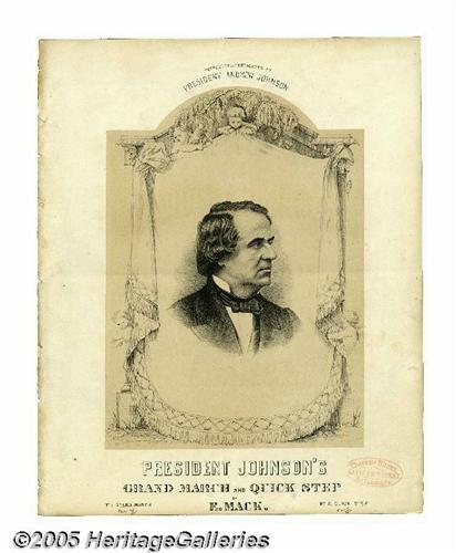 <B>1865 President Andrew Johnson Sheet Music</B></I> Wonderful copy of <I>President Johnson's Grand March and Quick Step.</B></I> "Respectfully Dedicated to President Andrew Johnson." This is the <I>Quick Step</B></I> written by E. Mack and published in Philadelphia by Lee & Walker. Cover has stamp of "Charlotte Blume [Music Store] Pittsburgh, Pa." Printed in tan and brown with bold portrait of Abraham Lincoln's successor. Disbound from album. Eight pages, 10 1/4" x 12 3/4". Excellent condition and a fine display piece for a tough "candidate." Sometimes seen lacking pictorial cover; this is the complete version. Lot:258