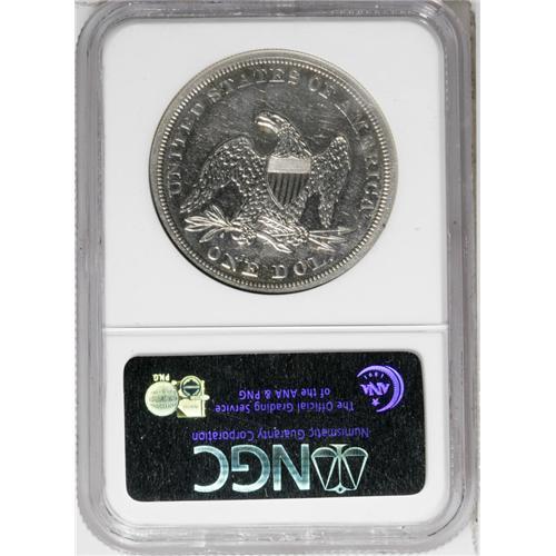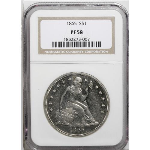 <B>1865<img border='0' src='http://www.heritagecoins.com/images/star.gif' width=10 height=10>$1> PR58 NGC.</B></I> A moderately hairlined gray-gold piece with significant reflectivity. Minor friction is noted on the highpoints, which may be due to either mishandling or light circulation. An affordable example from a mintage of just 500 specimens.