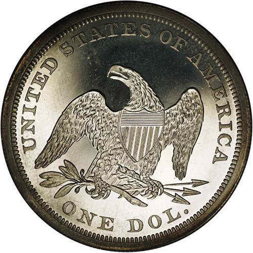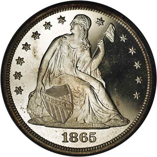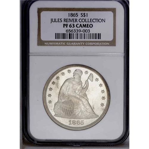 <B>1865<S$1> PR63 Cameo NGC.</B></I> A fully struck and undisturbed proof representative, the last collectible date of the No Motto run. Light freckles of walnut-brown color overlay the flashy fields and frosty devices. A curious raised line on the obverse rim at 7 o'clock is as made, caused by a scratch on the die. An even 500 proofs were distributed during this famous year in American history. Population: 10 in 63 Cameo, 19 finer (9/05).