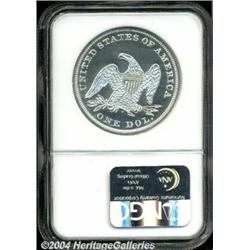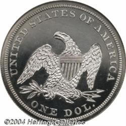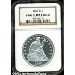 <B>1865<S$1> PR66 Deep Cameo NGC.</B></I> The final year of No Motto Seated dollar production, 1865 is also a desirable Civil War year. Many of the 46,500 business strikes produced this year were exported and subsequently melted, a fact that underscores the importance of the present proof offering. The decades that have elapsed since this coin left the Philadelphia mint have not tarnished either its technical merits or its aesthetic charm. Both sides are free of mentionable hairlines and the deeply reflective fields sparkle at all angles with a completely brilliant appearance. Sharply struck, as expected, with pleasing Deep Cameo contrast. <BR><BR><B>Important notice:</B> Heritage usually auctions material at the rate of 200-250 lots per hour. On some occasions eBay Live bid software or the Internet may not be able to keep up with the pace of the auction. We recommend placing a realistic absentee bid now as insurance to avoid disappointment. Occasionally the auctioneer may eliminate or reject an eBay Live bid, and the auctioneer may also reopen a lot after the close of the eBay live bidding (usually because we missed an audience bid), and may reject your bid even if it shows you as the winning bidder. By bidding via eBay Live, you agree that Heritage may award the lot to another bidder at its sole discretion under the circumstances described above or any other reasonable circumstances. Since eBay bids are not shown to us until we open the lot on the floor, we treat those bids just like floor bids. In most cases the floor responds before the eBay bid is presented to us, due to Internet lag time, so for consistency we have made it a policy that floor bids are always considered first over tie eBay live bids. Also please note that all Heritage lots purchased through eBay Live carry a 20% Buyer's Premium. Please make sure you read the Terms and Conditions before you bid. </span></font></tr></table></td></tr></table>