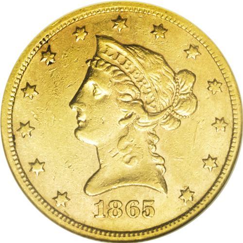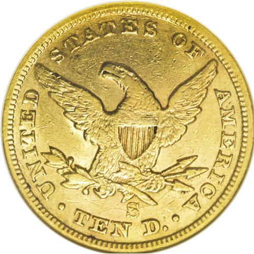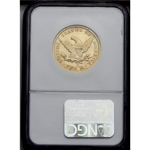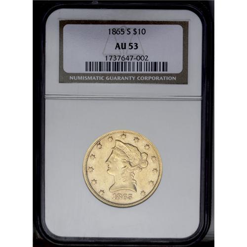 <B>1865-S<$10> AU53 NGC.</B></I> Perfect Date. So far, no 1865-S perfect date Liberty eagles have emerged from the wreck of the S.S. Republic (8/06). This may seem remarkable, given the fact that NGC has graded 243 1865-S double eagles from that now-famous shipwreck. However, the double eagle's mintage was in excess of one million pieces, while the eagle saw a paltry production of just 16,700 coins. While not particularly low compared to other S-mint issues of the same era, the obviously high attrition rate of these West Coast coins has left few survivors to serve as numismatic representatives. This green-gold example has a significant overlay of reddish patina. The striking details seem typical, with softness observed on the obverse stars and over the central devices. Moderate highpoint wear and a modicum of small abrasions imply the assigned grade level. An oval-shaped die lump on Liberty's cheek is apparently diagnostic of the issue. With so few examples surviving that rate finer than XF, this offering constitutes an important opportunity for the specialist.<BR><I>From The Clifton Rodenburg Collection.</B></I>