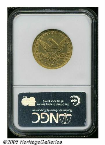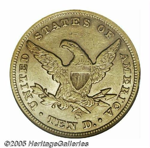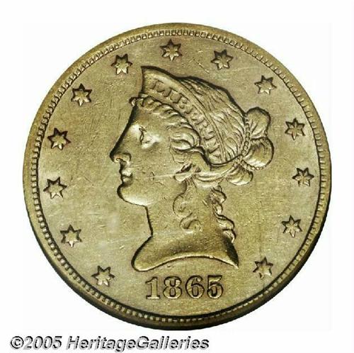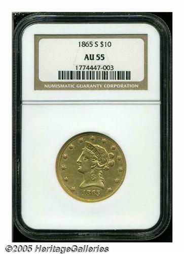 <B>1865-S<$10> AU55 NGC.</B></I> Struck from the normal date dies, being scarcer than the inverted date as such. The reverse is slightly doubled, apparently having been struck from a rehubbed die. The 1865-S Normal Date is a very rare issue and one of the most impressive condition rarities in the entire Coronet Ten Dollar series. A bit softly struck, the smooth yellow-gold surfaces are still mostly lustrous and show a distinctive, oval-shaped die lump on Liberty's cheek that is apparently diagnostic of the issue. Population: 4 in 55, 5 finer (5/05).