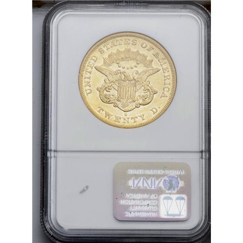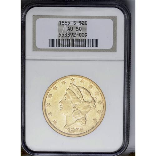 <B>1865-S<$20> AU50 NGC.</B></I> Lightly worn with attractive orange-honey surfaces that retain some of their original luster. Some marks on Liberty's cheek keep this coin from a higher grade.
