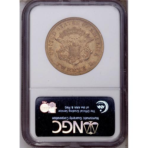 <B>1865-S $20 AU55 NGC.</B></I> This coin shows the normal amount of abrasions, scuffs, and bagmarks from its brief duration in the channels of commerce, but it is appealingly well struck and pleasantly detailed. The surfaces are an attractive red-gold, deeper in the protected areas. This coin would serve nicely as a historic reminder of the rough-and-tumble San Francisco of the immediate post-Civil War era.