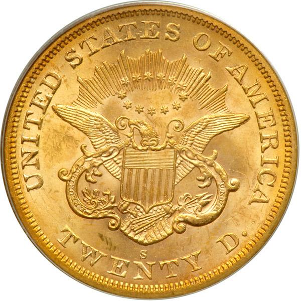1865-S $20 Liberty. PCGS graded MS-63 PQ. Brother Jonathan 781. A nice frosty uncirculated example. The 1865-S Brother Jonathan group is a perennially favorite issue in the Liberty head series. It is also extremely difficult to locate in pieces now that most have found homes in major collections. This is one of the finer looking specimens, albeit in modest MS63 but with qualities that send it to the front of the line. An almost magnificent coin, it has softly frosted mint luster and each side (but more so the reverse), shows a lively interplay of peach-colored orange-gold to bright reddish-pink patina. Sharply defined throughout, there are a few small, insignificant luster grazes in the fields but only trivial marks seen, and these mostly require a glass to find. It may be awhile before a similar choice grade 1865-S twenty such as this is again offered for sale at public auction (PCGS # 8944) .