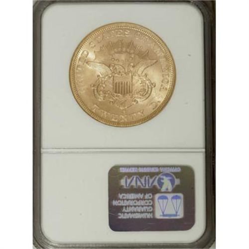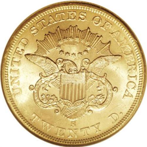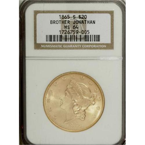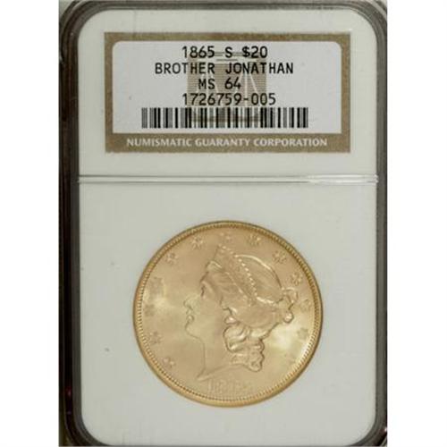 <B>1865-S $20 MS64 NGC.</B></I> Ex: <I>Brother Jonathan.</B></I> Jeff Garrett and Ron Guth (2006) note that more than 500 1865-S double eagles were found on the wreck of the <I>S.S. Brother Jonathan, </B></I>ranging in grade from About Uncirculated to Mint State 66. This near-Gem representative exhibits pleasing luster emanating from brass-gold surfaces. Most of the design elements benefited from a relatively sharp strike, though typical softness is visible in some of the star centers. A few minor obverse marks define the grade. NGC <I>Brother Jonathan </B></I>Census: 57 in 64, 54 finer (5/07).<BR><BR><b>Shipping:</b> Coins & Currency (<a target="_blank" href="http://www.heritageauctions.com/common/shipping.php">view shipping information</a>)