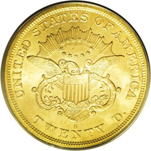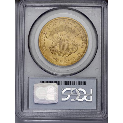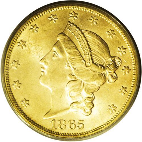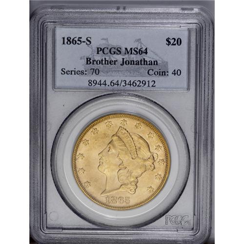 <B>1865-S<$20> MS64 PCGS.</B></I> Ex: Brother Jonathan. A lustrous and smooth near-Gem that displays light chestnut-gold and steel-gray patina. The reverse is particularly unabraded. Double eagles from the <I>S.S. Brother Jonathan</B></I> survived in better shape than passengers of the vessel, who were robbed by opportunists following the shipwreck.<BR><I>From The Hamburg-Sonoma Collection.</B></I>