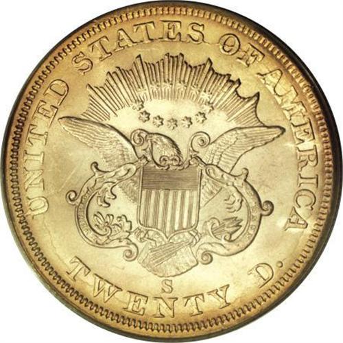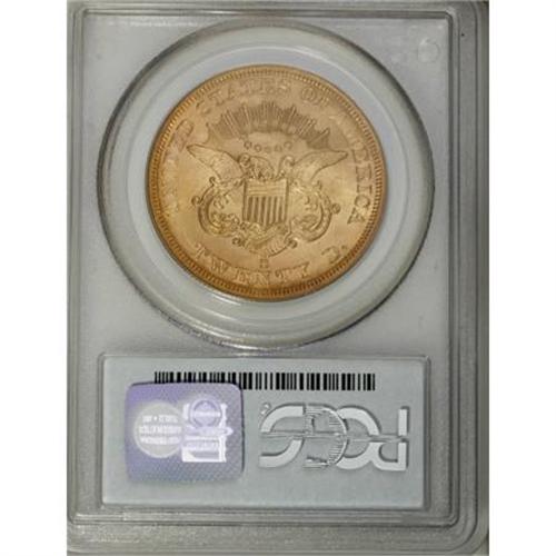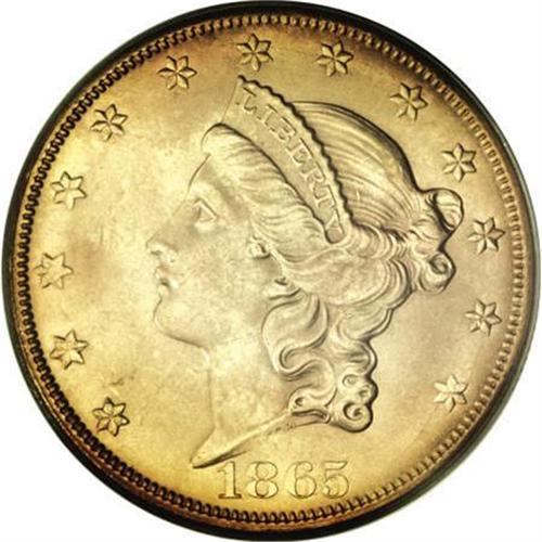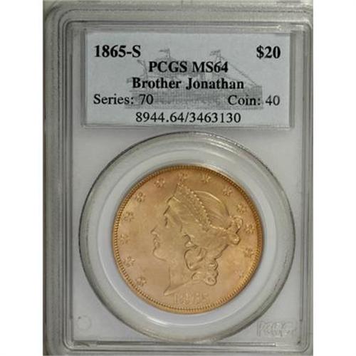 <B>1865-S $20 MS64 PCGS.</B></I> Ex: <I>S.S. Brother Jonathan</B></I>. What 1857-S is to mid-date Type One double eagles in the wake of the <I>S.S. Central America</B></I> discovery, so the 1865-S has become to later Type One twenties. With a pair of shipwrecks, the <I>S.S. Republic </B></I>and the <I>S.S. Brother Jonathan</B></I>, both yielding Mint State examples, it has become one of the most readily collectible issues in Uncirculated states.<BR> This slightly hazy orange-gold exemplar has the distinctive coloration of a <I>Brother Jonathan</B></I> coin, with streaks of richer peach at the upper obverse. Well struck with a slightly hazy appearance on the well-preserved obverse. On the reverse, a thin die crack laces through the reverse peripheral lettering. PCGS has graded just 23 finer examples (1/08).<BR><BR><B>Coin Engraver:</B> James B. Longacre<BR><BR><b>Shipping:</b> Coins & Currency (<a target="_blank" href="http://www.heritageauctions.com/common/shipping.php">view shipping information</a>)<BR><BR><B>Important