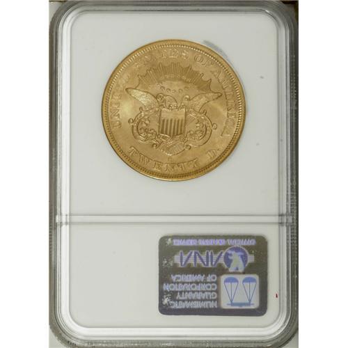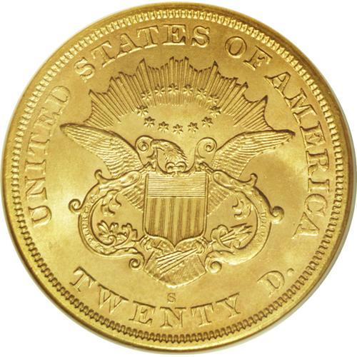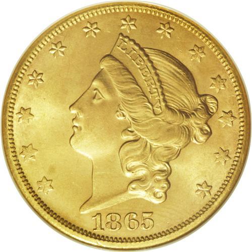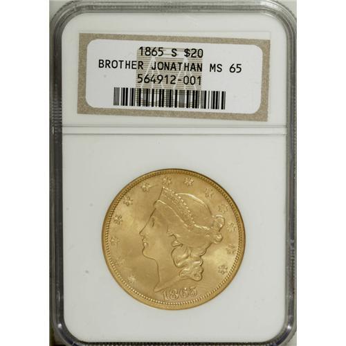<B>1865-S $20 MS65 NGC.</B></I> Ex: Brother Jonathan. Prior to the <I>S.S. Brother Jonathan</B></I> sale, in 1999, the 1865-S double eagle was rare in high grades. The condition-conscious Harry W. Bass, Jr. was only able to find an XF example for his collection. The <I>Brother Jonathan</B></I> and the <I>S.S. Republic,</B></I> however, each contained hundreds of pieces, many of them in Mint State. According to Garrett and Guth (2006): "Today the 1865-S double eagle is available in grades unheard of several years ago. These coins are tangible links to these fascinating treasures and an important time in American history." The current offering is a lustrous Gem representative with amazingly smooth, matte-like surfaces. Except for a few of the obverse stars, the design elements are boldly impressed, and distracting marks or blemishes are nonexistent.<BR><BR><b>Shipping:</b> Coin/Currency (<a target="_blank" href="http://www.heritageauctions.com/common/shipping.php">view shipping information</a>)