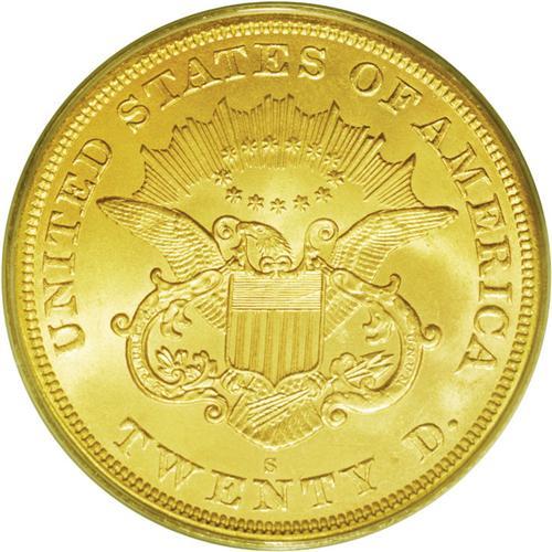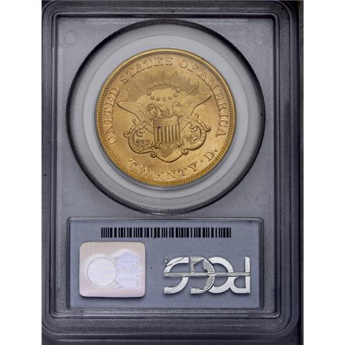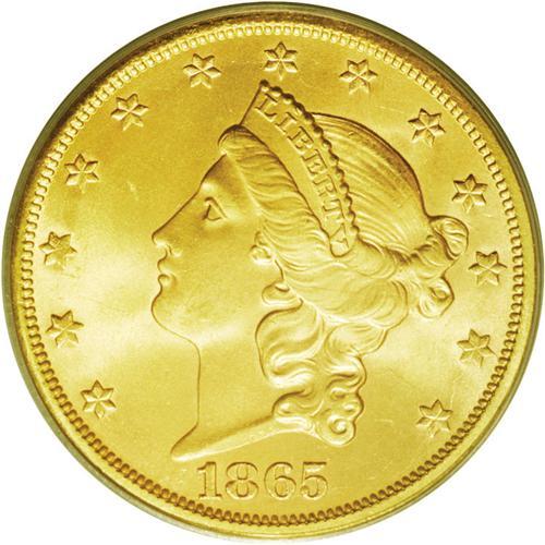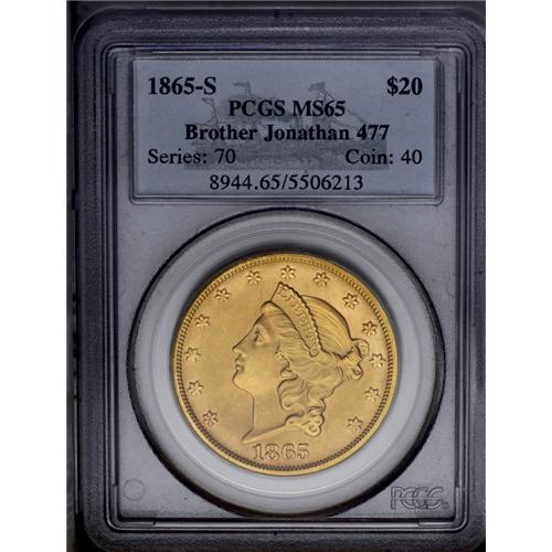 <B>1865-S<$20> MS65 PCGS.</B></I> Ex: <I>S.S. Brother Jonathan.</B></I> Sharply struck with rich orange-gold luster and frosty surfaces. A few tiny surface marks can be seen, but the overall appearance and eye-appeal is hard to beat. The distinctive orange coloration found on this example is typical of most coins from this particular treasure, located off the coast of northern California, not far from Crescent City. The steamship <I>S.S. Brother Jonathan</B></I> was lost to a gale on July 30, 1865, about an hour out of the harbor at Crescent City. There were only a few survivors who reached the safety of shore in a single wooden lifeboat. Population: 19 in 65, 2 finer (3/06). <BR><BR><B>Important notice:</B> Heritage usually auctions material at the rate of 200-250 lots per hour. On some occasions eBay Live bid software or the Internet may not be able to keep up with the pace of the auction. We recommend placing a realistic absentee bid now as insurance to avoid disappointment. Occasionally the auctioneer may eliminate or reject an eBay Live bid, and the auctioneer may also reopen a lot after the close of the eBay live bidding (usually because we missed an audience bid), and may reject your bid even if it shows you as the winning bidder. By bidding via eBay Live, you agree that Heritage may award the lot to another bidder at its sole discretion under the circumstances described above or any other reasonable circumstances. Since eBay bids are not shown to us until we open the lot on the floor, we treat those bids just like floor bids. In most cases the floor responds before the eBay bid is presented to us, due to Internet lag time, so for consistency we have made it a policy that floor bids are always considered first over tie eBay live bids. Also please note that all Heritage lots purchased through eBay Live carry a 20% Buyer's Premium. Please make sure you read the Terms and Conditions before you bid. This lot is being auctioned in conjunction with a live floor auction by Heritage Galleries & Auctioneers. All final auction and invoice information will be supplied by Heritage Galleries & Auctioneers, and all other information should be considered preliminary. Lot:4216 <BR><BR><B>Winning Notification and Billing:</B> After the FINAL session in this auction is complete, Heritage will send e-mail and snail mail invoices. This process normally takes several days. All final auction and invoice information will be supplied by Heritage Galleries & Auctioneers, and all other information should be considered preliminary. <BR><BR>This auction will be conducted on a live auction floor and over the Internet through eBay Live. If you choose to place an absentee bid, please take a moment to <font color='#0000ff'><u><a href='http://pages.ebay.com/liveauctions/help/before/laabsentee.html'>learn how eBay Live absentee bidding works</a></u></font><font color='#000000'>