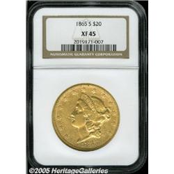 <B>1865-S $20 XF45 NGC.</B></I> The moderately abraded straw-gold surfaces display considerable luster, for the grade. A solidly graded XF45 example.