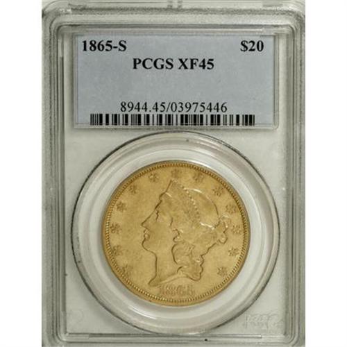 <B>1865-S $20 XF45 PCGS.</B></I> PCGS Population (84/555). NGC Census: (183/816). Mintage: 1,042,500. Numismedia Wsl. Price for NGC/PCGS coin in XF45: $744. (#8944)<BR><BR><b>Shipping:</b> Coins & Currency (<a target="_blank" href="http://www.heritageauctions.com/common/shipping.php">view shipping information</a>)