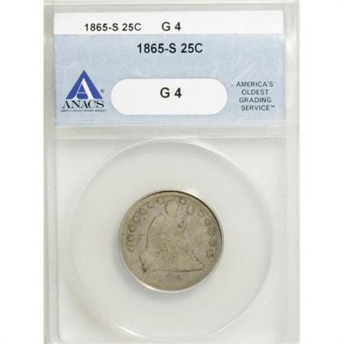 <B>1865-S 25C G4 ANACS.</B></I> NGC Census: (0/29). PCGS Population (0/31). Mintage: 41,000. Numismedia Wsl. Price for NGC/PCGS coin in G4 : $69. (#5462)<BR><BR><B>Coin Engraver:</B> Christian Gobrecht<BR><BR><b>Shipping:</b> Coins & Currency (<a target="_blank" href="http://www.heritageauctions.com/common/shipping.php">view shipping information</a>)