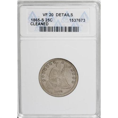 <B>1865-S 25C --Cleaned--ANACS. VF20 Details.</B></I> NGC Census: (2/26). PCGS Population (1/26). Mintage: 41,000. Numismedia Wsl. Price for NGC/PCGS coin in VF20: $242. (#5462)<BR><BR><B>Coin Engraver:</B> Christian Gobrecht<BR><BR><b>Shipping:</b> Coins & Currency (<a target="_blank" href="http://www.heritageauctions.com/common/shipping.php">view shipping information</a>\)