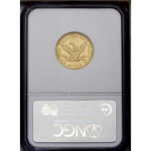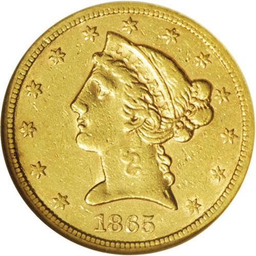 <B>1865-S<$5> AU50 NGC.</B></I> A scarce S-mint issue from the year the Civil War ended, this is one of the most challenging half eagles to find in high grade. Much luster still radiates from the medium gold surfaces of this piece. There are myriad small abrasions, more so on the reverse than the obverse, none of them overly distracting or much visible without a loupe. the strike is a bit weak on the lower reverse, but decent elsewhere. Census: 3 in 50, 38 finer (3/06). <BR><BR><B>Important notice:</B> Heritage usually auctions material at the rate of 200-250 lots per hour. On some occasions eBay Live bid software or the Internet may not be able to keep up with the pace of the auction. We recommend placing a realistic absentee bid now as insurance to avoid disappointment. Occasionally the auctioneer may eliminate or reject an eBay Live bid, and the auctioneer may also reopen a lot after the close of the eBay live bidding (usually because we missed an audience bid), and may reject your bid even if it shows you as the winning bidder. By bidding via eBay Live, you agree that Heritage may award the lot to another bidder at its sole discretion under the circumstances described above or any other reasonable circumstances. Since eBay bids are not shown to us until we open the lot on the floor, we treat those bids just like floor bids. In most cases the floor responds before the eBay bid is presented to us, due to Internet lag time, so for consistency we have made it a policy that floor bids are always considered first over tie eBay live bids. Also please note that all Heritage lots purchased through eBay Live carry a 20% Buyer's Premium. Please make sure you read the Terms and Conditions before you bid. This lot is being auctioned in conjunction with a live floor auction by Heritage Galleries & Auctioneers. All final auction and invoice information will be supplied by Heritage Galleries & Auctioneers, and all other information should be considered preliminary. Lot:2759 <BR><BR><B>Winning Notification and Billing:</B> After the FINAL session in this auction is complete, Heritage will send e-mail and snail mail invoices. This process normally takes several days. All final auction and invoice information will be supplied by Heritage Galleries & Auctioneers, and all other information should be considered preliminary. <BR><BR>This auction will be conducted on a live auction floor and over the Internet through eBay Live. If you choose to place an absentee bid, please take a moment to <font color='#0000ff'><u><a href='http://pages.ebay.com/liveauctions/help/before/laabsentee.html'>learn how eBay Live absentee bidding works</a></u></font><font color='#000000'>