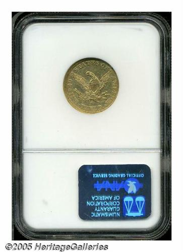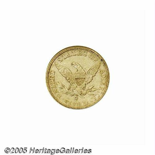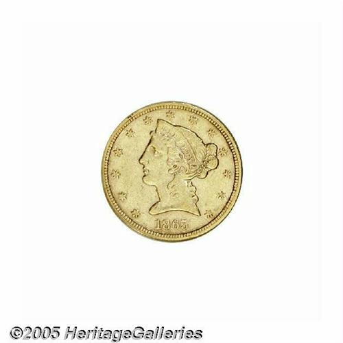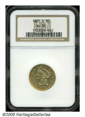 <B>1865-S<$5> AU55 NGC.</B></I> The '65-S is one of the most conditionally challenging of all Liberty Half Eagles, with the majority of known '65-S Fives are well worn into the VF and lower categories. The surfaces exhibit a fully bright appearance, and the striking details are well brought up throughout.