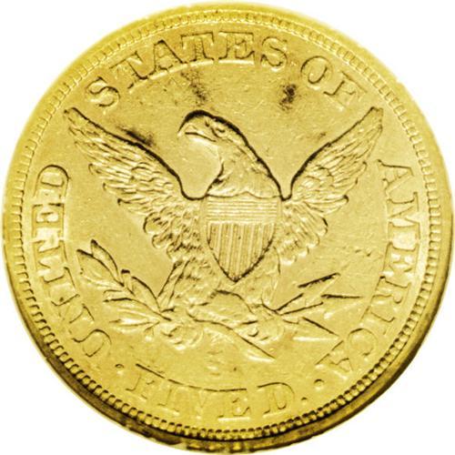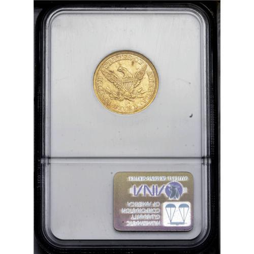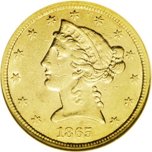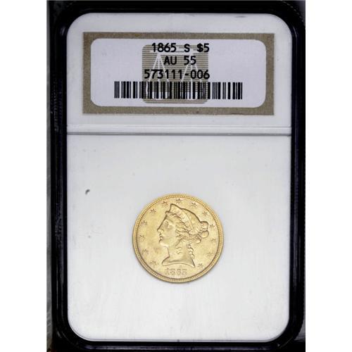 <B>1865-S<$5> AU55 NGC.</B></I> This date is quite difficult to find in grades above Extremely Fine. The present coin shows some luster in the fields and boasts a decent strike. Average surface marks are present, but they are not individually distracting and blend well into the coin. Minor haze is present on both sides, as well as some minor copper splashes above the eagle. Census: 18 in 55, 15 finer (3/06). <BR><BR><B>Important notice:</B> Heritage usually auctions material at the rate of 200-250 lots per hour. On some occasions eBay Live bid software or the Internet may not be able to keep up with the pace of the auction. We recommend placing a realistic absentee bid now as insurance to avoid disappointment. Occasionally the auctioneer may eliminate or reject an eBay Live bid, and the auctioneer may also reopen a lot after the close of the eBay live bidding (usually because we missed an audience bid), and may reject your bid even if it shows you as the winning bidder. By bidding via eBay Live, you agree that Heritage may award the lot to another bidder at its sole discretion under the circumstances described above or any other reasonable circumstances. Since eBay bids are not shown to us until we open the lot on the floor, we treat those bids just like floor bids. In most cases the floor responds before the eBay bid is presented to us, due to Internet lag time, so for consistency we have made it a policy that floor bids are always considered first over tie eBay live bids. Also please note that all Heritage lots purchased through eBay Live carry a 20% Buyer's Premium. Please make sure you read the Terms and Conditions before you bid. This lot is being auctioned in conjunction with a live floor auction by Heritage Galleries & Auctioneers. All final auction and invoice information will be supplied by Heritage Galleries & Auctioneers, and all other information should be considered preliminary. Lot:2760 <BR><BR><B>Winning Notification and Billing:</B> After the FINAL session in this auction is complete, Heritage will send e-mail and snail mail invoices. This process normally takes several days. All final auction and invoice information will be supplied by Heritage Galleries & Auctioneers, and all other information should be considered preliminary. <BR><BR>This auction will be conducted on a live auction floor and over the Internet through eBay Live. If you choose to place an absentee bid, please take a moment to <font color='#0000ff'><u><a href='http://pages.ebay.com/liveauctions/help/before/laabsentee.html'>learn how eBay Live absentee bidding works</a></u></font><font color='#000000'>