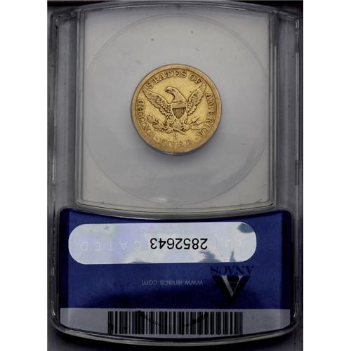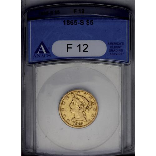 <B>1865-S<$5> Fine 12 ANACS.</B></I> Somewhat unevenly worn but showing nearly complete design details and pale greenish coloration. A couple of metal-exposing abrasions are noted near the eagle's right (facing) wingtip; the remaining surface blemishes are small and superficial. A difficult coin to locate at any grade level.