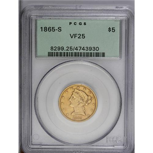 1865-S $5 VF25 PCGS. An attractive, but well-circulate