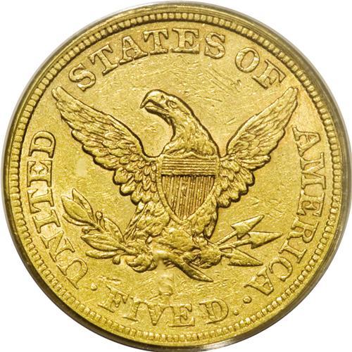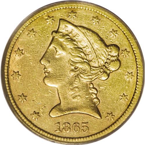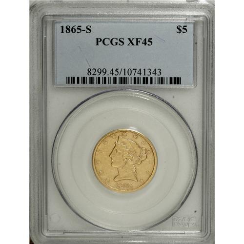 <B>1865-S $5 XF45 PCGS.</B></I> A lightly circulated example with finely abraded surfaces, consistent with the grade. Despite a mintage in excess of 27,000 coins, this is a scarce date that is seldom available in any grade. This attractive piece has light yellow-gold surfaces with the faintest hints of pale pink toning.<BR><BR><b>Shipping:</b> Coins & Currency (<a target="_blank" href="http://www.heritageauctions.com/common/shipping.php">view shipping information</a>)