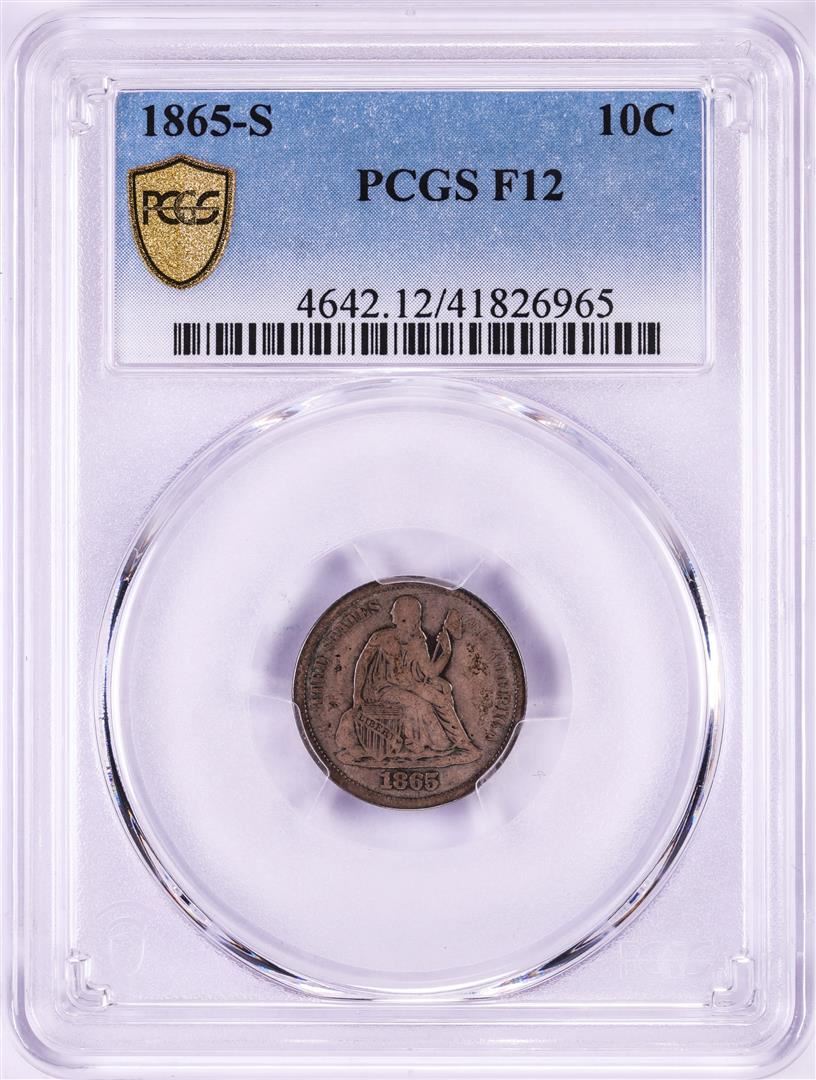 One 1865-S Seated Liberty Dime Coin PCGS F12. PCGS Graded.