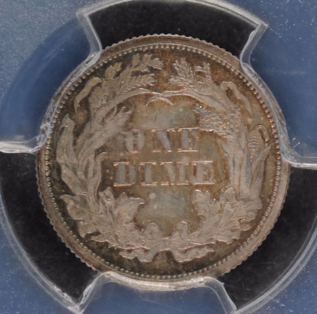 1865 SEATED DIME, PCGS PR-66 RAINBOW COLORS, RARE!! PCGS PRICE GUIDE=$3900.00