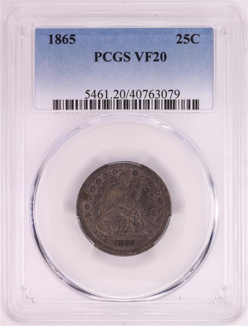 One 1865 Seated Liberty Quarter Coin NGC VF20. NGC Certified.