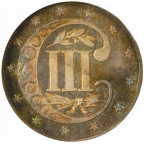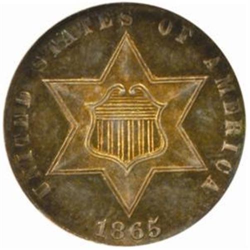 <style type="text/css"> body, td, th { font-family: Arial, Helvetica, sans-serif; font-size: 12px; color: #482424; margin: 0px; padding: 0px; } #header { background-image: url(http://www.bowersandmerena.com/ebay/images/template_v3_01.gif); clear: both; background-color: #590303; border-top-width: 2px; border-top-style: solid; border-top-color: #B38C4F;}#header #header_wrapper { height: 75px; clear: both; width: 800px; margin-right: auto; margin-left: auto; background-image: url(http://www.bowersandmerena.com/ebay/images/template_v3_03.gif); background-repeat: no-repeat; background-position: right; color: #F3EDCC;}#header #header_wrapper #header_logo { float: left; height: 75px; width: 444px; background-image: url(http://www.bowersandmerena.com/ebay/images/template_v3_02.gif); background-repeat: no-repeat; font-size: 10px; text-transform: capitalize; color: #B38C4F;}#header #header_wrapper #header_right { float: left; height: 75px; width: 356px; text-align: right;}#header #header_wrapper #header_right #headerLoginBtn { margin-bottom: 30px;}#header #header_wrapper #header_right input#txtSearch { color: #B49056; border: 1px solid #B49056; width: 175px; padding-top: 3px; padding-right: 3px; padding-bottom: 4px; padding-left: 3px;}#nav { height: 37px; background-image: url(http://www.bowersandmerena.com/ebay/images/template_v3_05.gif); clear: both;}#nav #nav_wrapper { height: 35px; width: 800px; margin-right: auto; margin-left: auto; border-left-width: 1px; border-left-style: solid; border-left-color: #B38C4F;}#nav #nav_wrapper a { padding-right: 15px; padding-left: 15px; border-right-width: 1px; border-right-style: solid; border-right-color: #B38C4F; height: 25px; padding-top: 10px; display: block; float: left; text-decoration: none; font-weight: bold; color: #5D0303;}#nav #nav_wrapper a:hover { color: #B38C4F;}#nav #nav_wrapper #search { float: right; padding-top: 7px;}#nav #nav_wrapper #search #txtSearch { font-family: Arial, Helvetica, sans-serif; font-size: 10px; text-transform: uppercase; color: #D2AE75; border: 1px solid #B38C4F; padding: 3px;}#content_bgd { background-image: url(http://www.bowersandmerena.com/ebay/images/template_v3_09.gif); background-repeat: repeat-y; background-position: center; padding-top: 15px; padding-bottom: 15px; background-color: #FBFBDB;}#content_wrapper { clear: both; height: auto; width: 800px; margin-right: auto; margin-left: auto;}.LotDetailWhite{ line-height:normal; font-size:13px; font-family: arial,helvetica,sans-serif; color: White; font-weight: bold;}.LotDetailInformation{ line-height:normal; font-size: 13px; font-family: arial,helvetica,sans-serif;}.LotDetailMessage{ line-height:normal; font-size: 13px; font-family: arial,helvetica,sans-serif; color: red;}}tr.HeaderAuctionTitle td { color: #000000; font-weight: bold; padding: 2px; background-image: url(http://www.bowersandmerena.com/ebay/images/template_v3_05.gif); background-repeat: repeat-x; border-bottom-width: 1px; border-bottom-style: solid; border-bottom-color: #B38C4F;}table.AuctionSummary a, table.AuctionSummary a:link, table.AuctionSummary a:visited { color: #0000FF; text-decoration: none;}}td.tableHeaderLeft { border-left-width: 1px; border-left-style: solid; border-left-color: #B38C4F;}td.tableHeaderRight { border-right-width: 1px; border-right-style: solid; border-right-color: #B38C4F;}td.tableCellMiddle { border-left-width: 1px; border-left-style: solid; border-left-color: #B38C4F; border-right-width: 1px; border-right-style: solid; border-right-color: #B38C4F; padding: 5px;}tr.footer td { border-top-width: 1px; border-top-style: solid; border-top-color: #B38C4F;}</style></head><body><div id="header"> <div id="header_wrapper"> <div id="header_logo"> </div> <div id="header_right"> </div> </div></div><div id="nav"> <div id="nav_wrapper"> <a href="http://www.bowersandmerena.com">Our eBayLive Auctions</a> <a href="#PaymentInfo">Payment Information</a> <a href="#ShippingInfo">Shipping Information</a> <a href="#About">About Bowers and Merena</a> </div></div><div id="content_bgd"> <div id="content_wrapper"> <table width="100%" border="0" cellpadding="5" cellspacing="0" class="AuctionSummary"> <tbody> <tr class="HeaderAuctionTitle" style="height: 25px;"> <td align="left" class="tableHeaderLeft" > </td> <td align="center" class="tableHeaderRight"> <span style="font-size: large;">Lot #347. 1865 Silver Three-Cent Piece. Proof-67 (NGC).</span> </td> </tr> <tr> <td colspan="3" class="tableCellMiddle"> This is one date in the Three-Cent Silver series that we do not offer with any degree of frequency, and with good reason. The business strike 1865 is a low-mintage coin with just 8,000 pieces produced, while proofs of that year almost certainly suffered an unusually heavy rate of attrition as the Civil War drew to an end. This exquisite Superb Gem is the most attractive survivor of the latter delivery that this cataloger can ever remember handling. Both sides are beautifully toned in blended shades of reddish-apricot, antique-copper, pink and cobalt-blue iridescence. Fully struck with radiant mint brilliance and nary a distracting blemish to report.