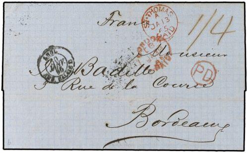 1865 Stampless envelope from the BRITISH POST OFFICE at ST. THOMAS with superb hanstamp of the ST. THOMAS PAID in red sent on English packet to Bordeaux via London. Wonderful quality.