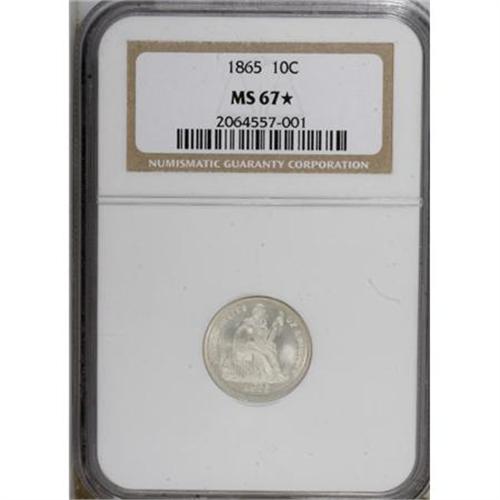 <B>1865 10C MS67 NGC.</B></I> Only 10,000 business strikes were produced in this final year of the Civil War. Examples are scarce in all grades, and predictably, Superb coins are very rarely seen. Sharply struck, with just the slightest softness on Liberty's hair and cap. The fields show evidence of light die striations, which have imparted a bright gleam to each side. Brilliant throughout, the surfaces are free from any mentionable abrasions. Population: 2 in MS67 <B> S</B></I>, three non-<B> S</B></I> coins are finer (9/07).<BR><BR><B>Coin Engraver:</B> Christian Gobrecht<BR><BR><b>Shipping:</b> Coins & Currency (<a target="_blank" href="http://www.heritageauctions.com/common/shipping.php">view shipping information</a>)