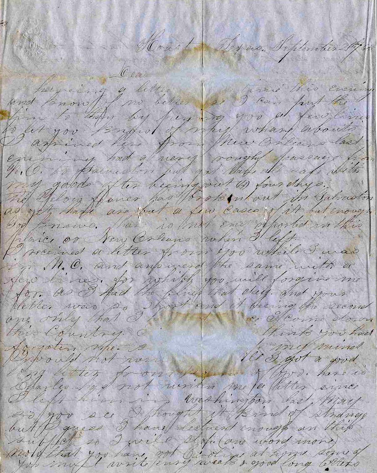 Autograph letter signed from Sutler James Coombs, stationed in Texas at General Custer's Headquarters. Written in ink and datelined ''Houston Texas September 27th/ [65],'' letter reads in part: ''…The yellow fever has broken out in Galveston…I have got home and have my goods here all wright. The Pay Master…will pay the Troops off tomorrow…James Coombs Gen Custer Hd Qrs Hempstead Texas.'' Letter measures approximately 8'' x 10''. Dampstaining obscures small portions of the text. Good condition.