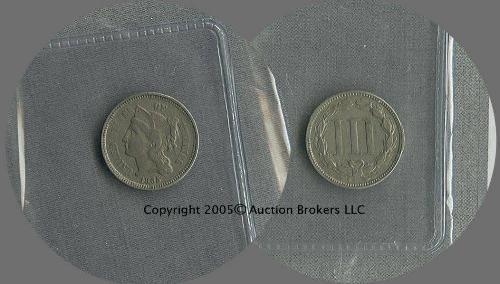 1865 Three Cent Nickel XF detail; First year of issue