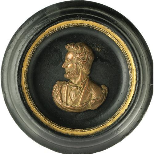 <B>1865 Tin Lincoln Relief Inset in Original Wood Frame.</B></I> Measures approximately 15" in diameter. "J. Powell F. Patented 1865" etched at the bottom of the tin, the very year of Lincoln's assassination. Lincoln's profile is affixed to the tin-backed frame by wire twist-ties. Frame is painted black, save for a decorative gold inset border. A few very small paint stains are visible on Lincoln; otherwise, the profile is very good. The frame shows some scattered paint loss, which only adds to the true antique appeal of this wonderful piece of Lincolniana, which would look good on the wall of any Lincoln collector.<BR><BR><b>Shipping:</b> Framed - with Glass, Large (<a target="_blank" href="http://www.heritageauctions.com/common/shipping.php">view shipping information</a>)