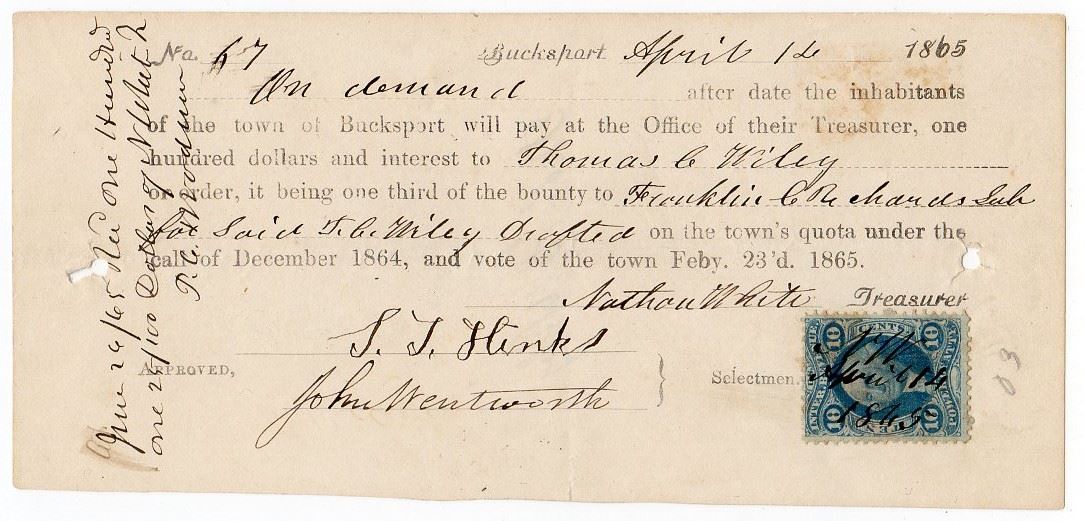 One 1865 Town of Bucksport $100 Bank Check with Stamp.