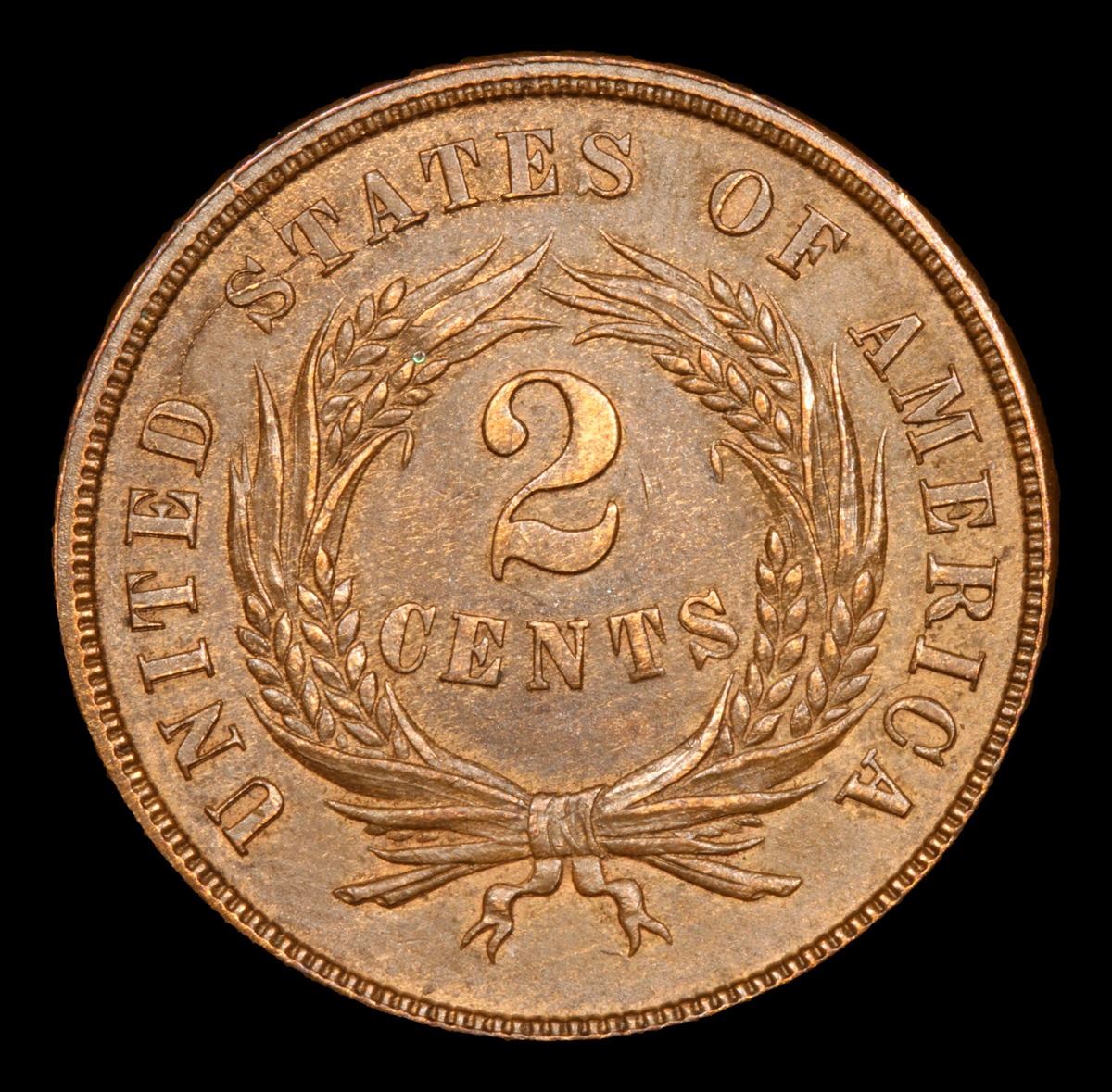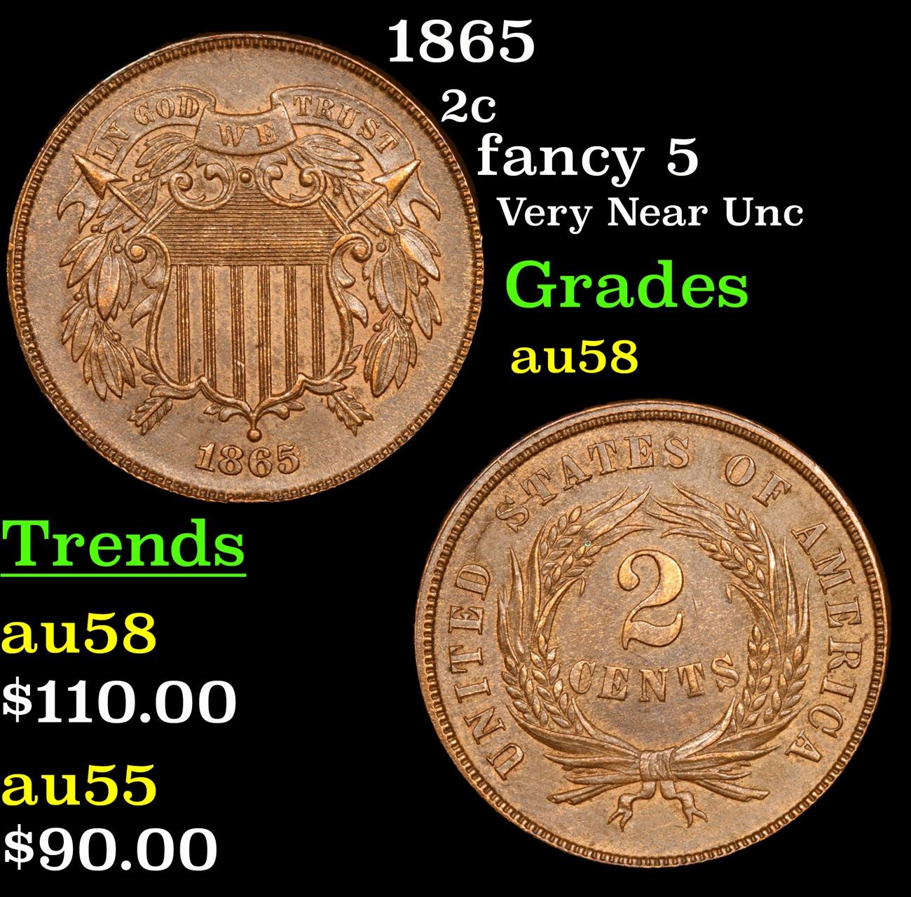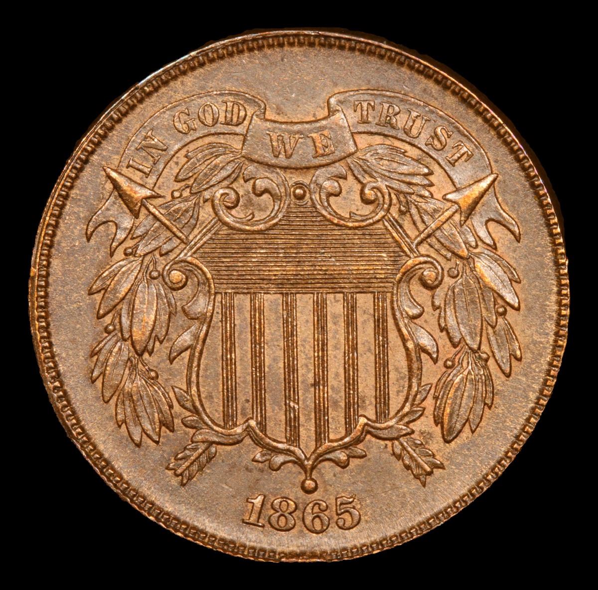1865 fancy 5 Very Near Unc Two Cent Piece 2c Grades Choice AU/BU Slider.