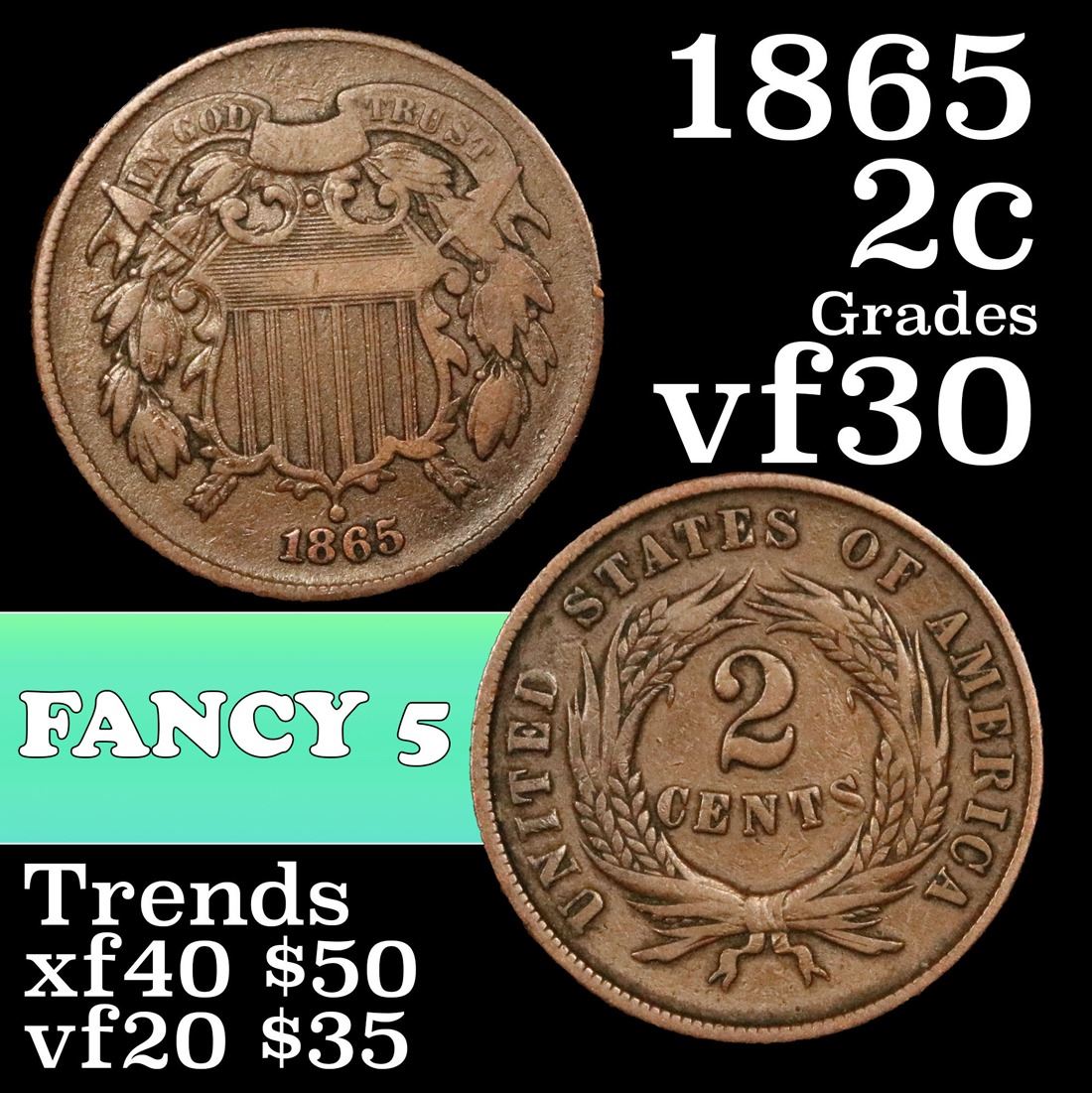 1865 Two Cent Piece 2c Grades vf++.