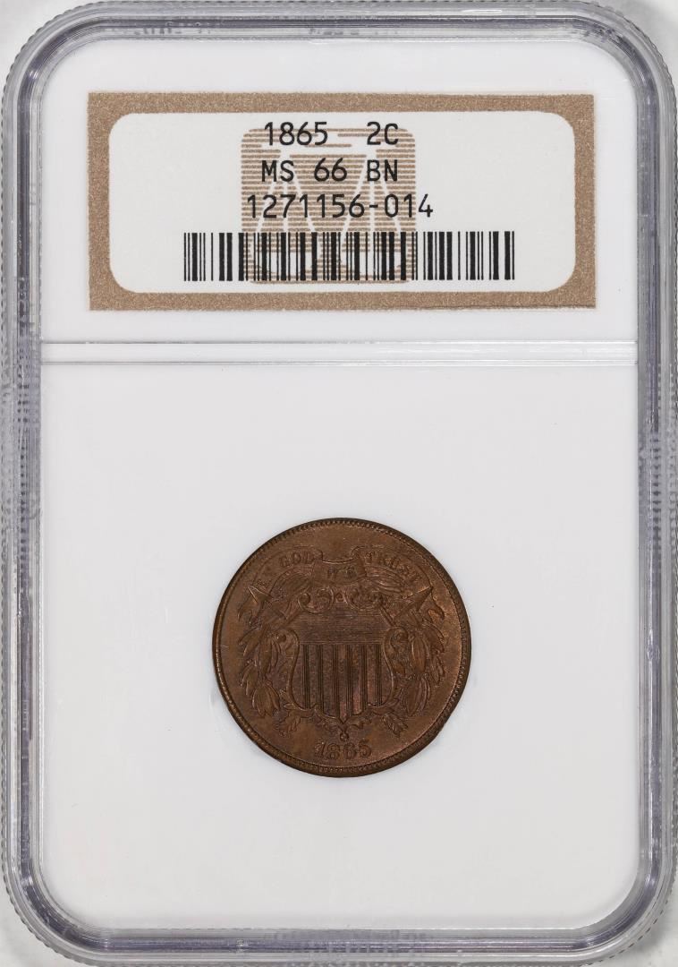 One 1865 Two Cent Piece NGC MS66BN. NGC Certified.