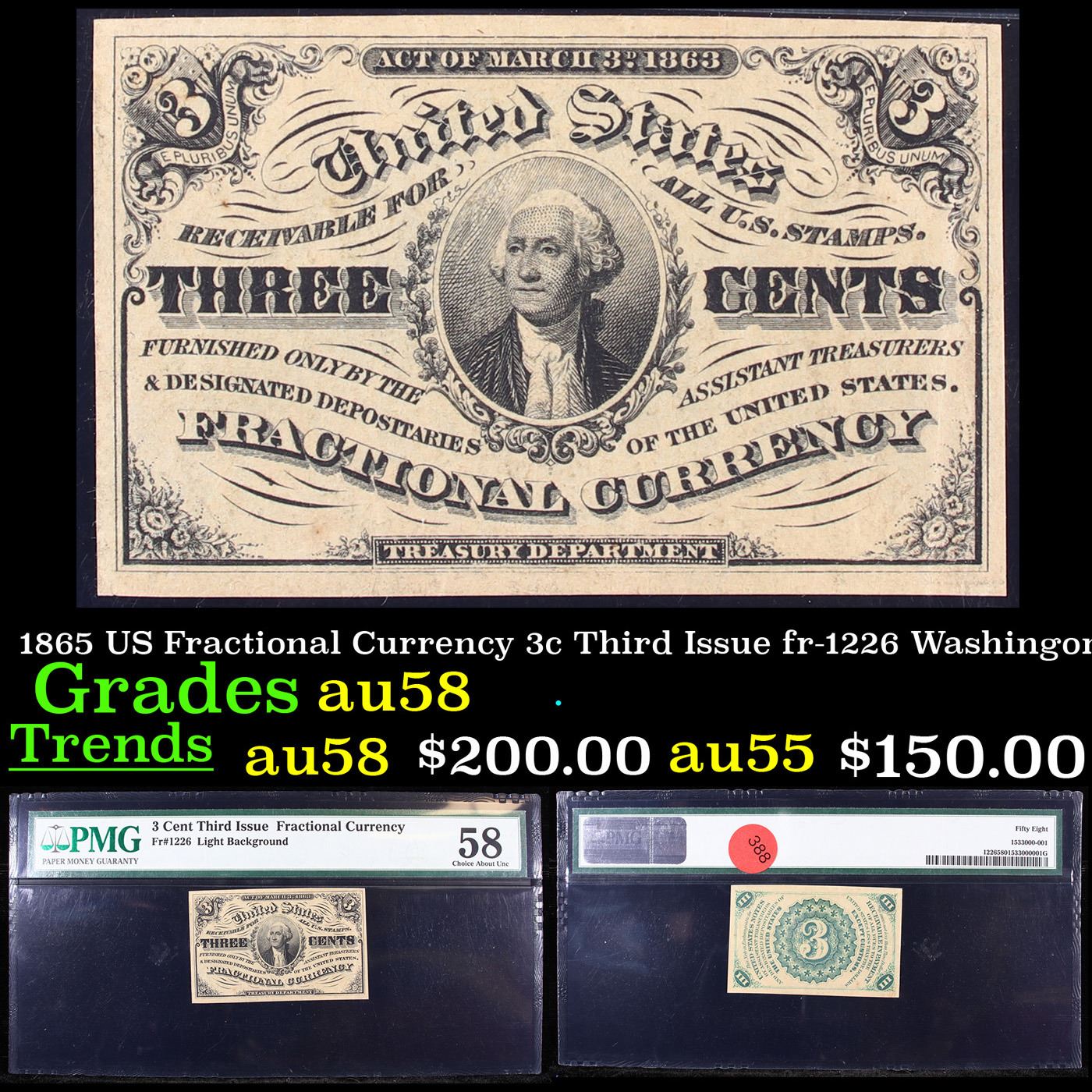 1865 US Fractional Currency 3c Third Issue fr-1226 Washingon Graded au58 By PMG.