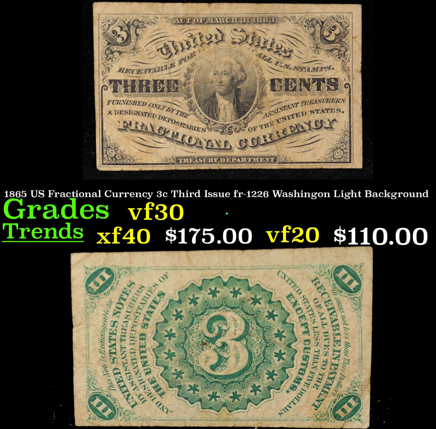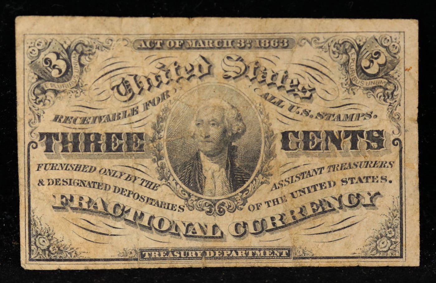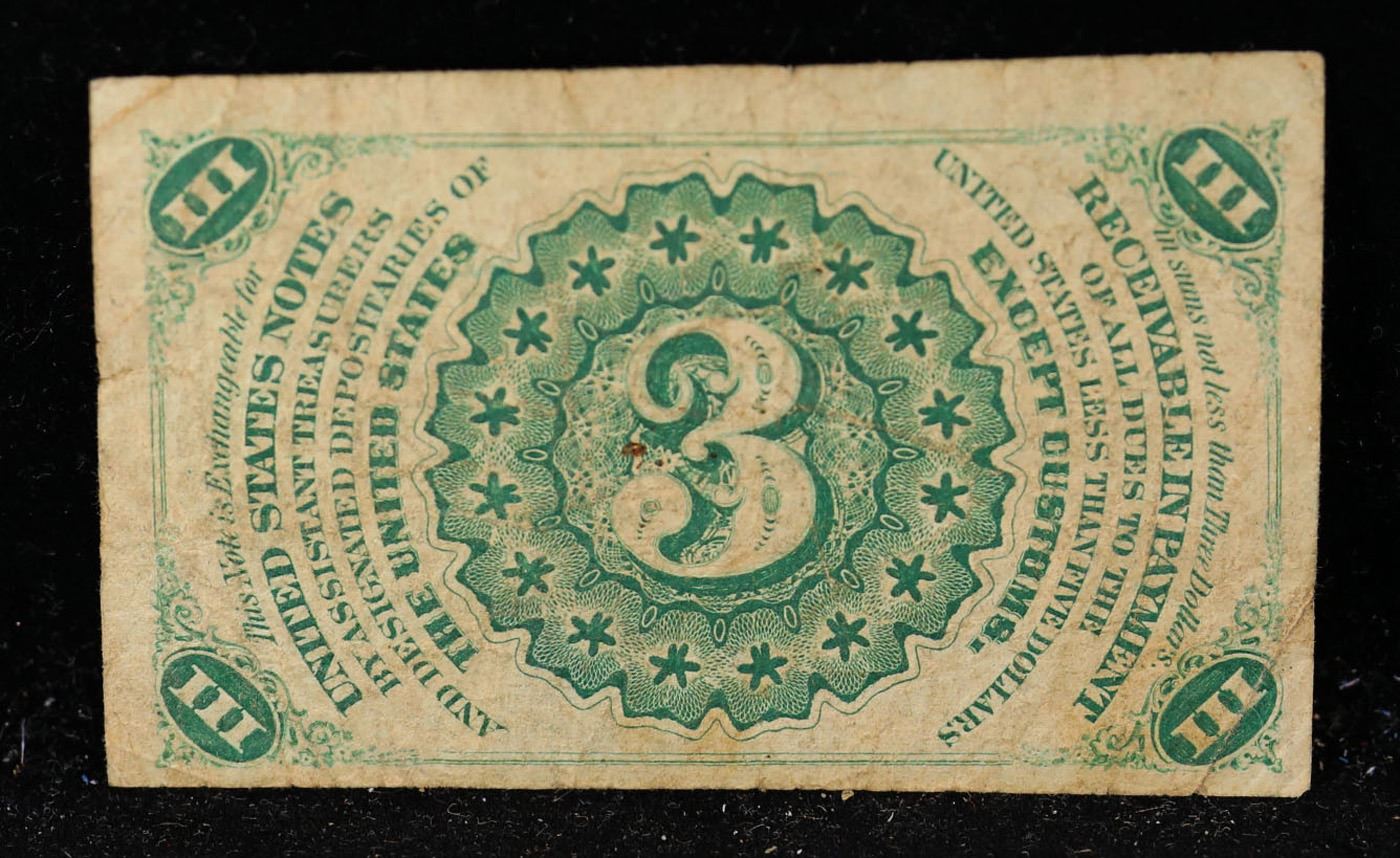 1865 US Fractional Currency 3c Third Issue fr-1226 Washingon Light Background Grades vf++. Fractional or postage currency has a rich history. At the beginning of the Civil War people starting hoarding coins for their precious metal content. Coins became difficult to find because of the hoarding. People started to try to use stamps instead of coins as a means of commerce. The government decided to help ease the hoarding issue by issuing “paper coins” also known as postage currency or fractional currency. Fractional currency was first issued on August 21, 1862 and they were last issued on February 15, 1876. Three cents, five cents, ten cents, twenty-five cents, and fifty cents notes were all issued. Fractional currency is physically smaller than other United States money. It also does not have a serial number.