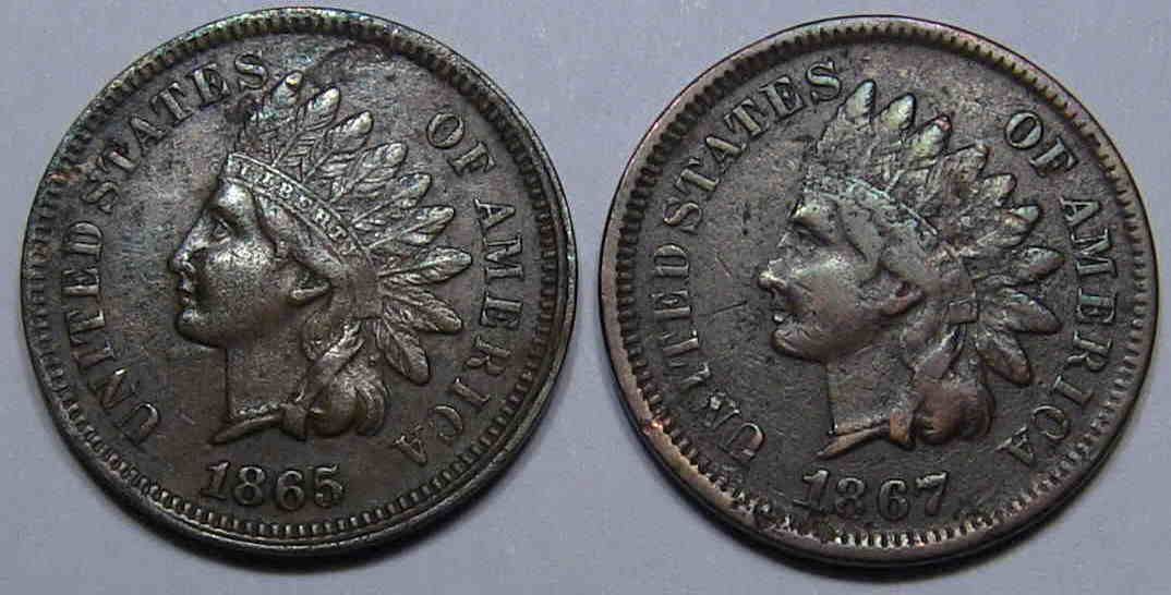 EST $45.00 - $60.00. Each has some pitting and corrosion. Much detail remains. The 1865 has EF detail while the 1867 has Fine detail.