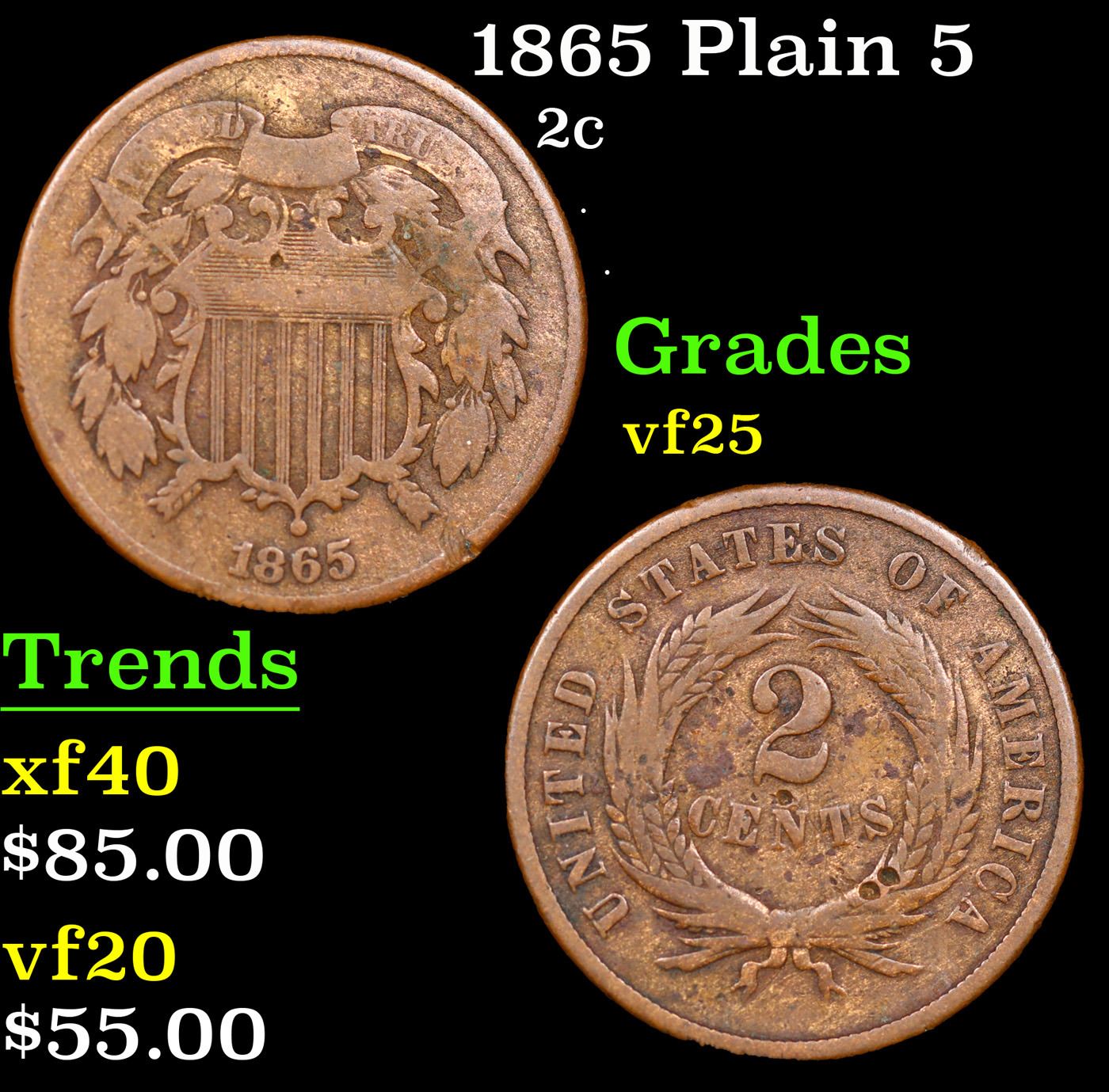 1865 plain 5 Two Cent Piece 2c Grades vf+.