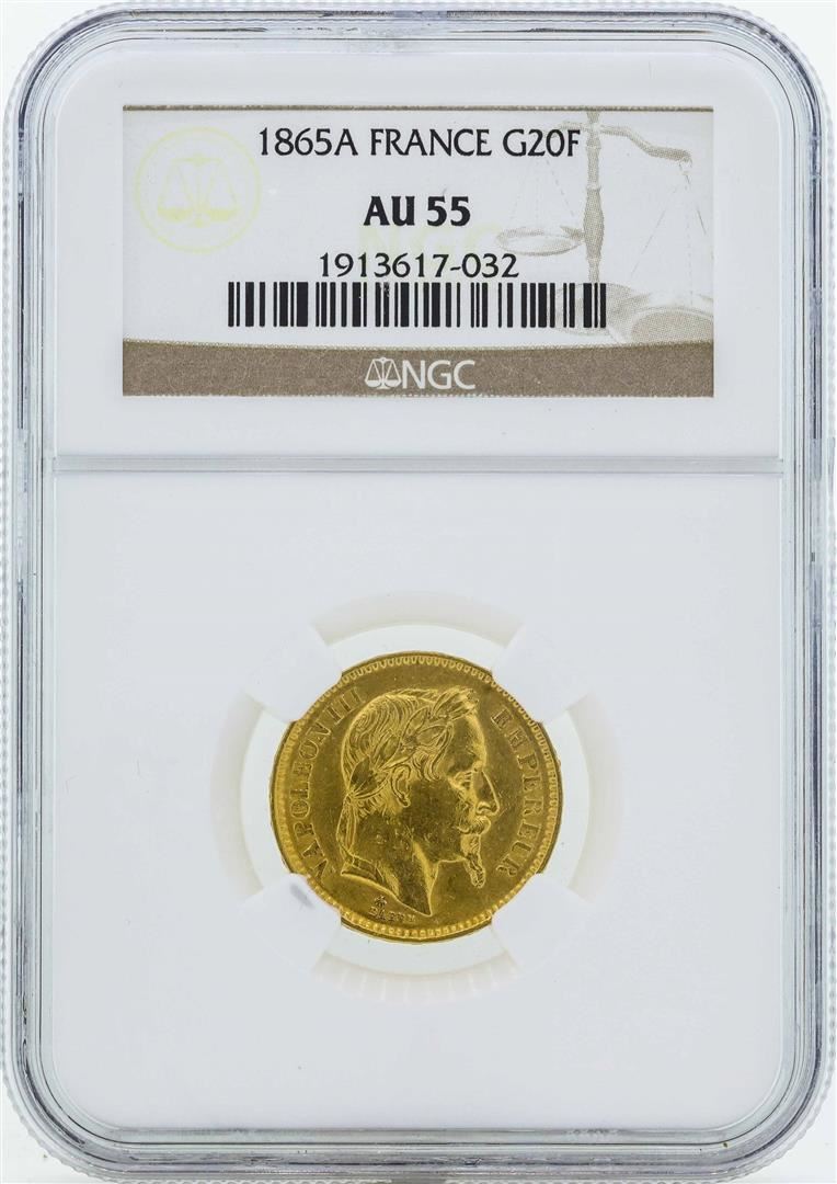 One 1865A France 20 Francs Gold Coin NGC AU55. NGC Certified.