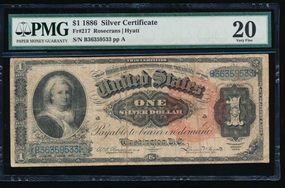 One 1866 $1 Martha Washington Silver Certificate PMG 20.